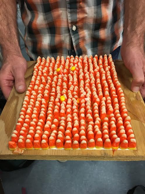 piece of paper. We estimated 704 candy corn, but we rounded down to 700. We were off by far. The actual number was 497.