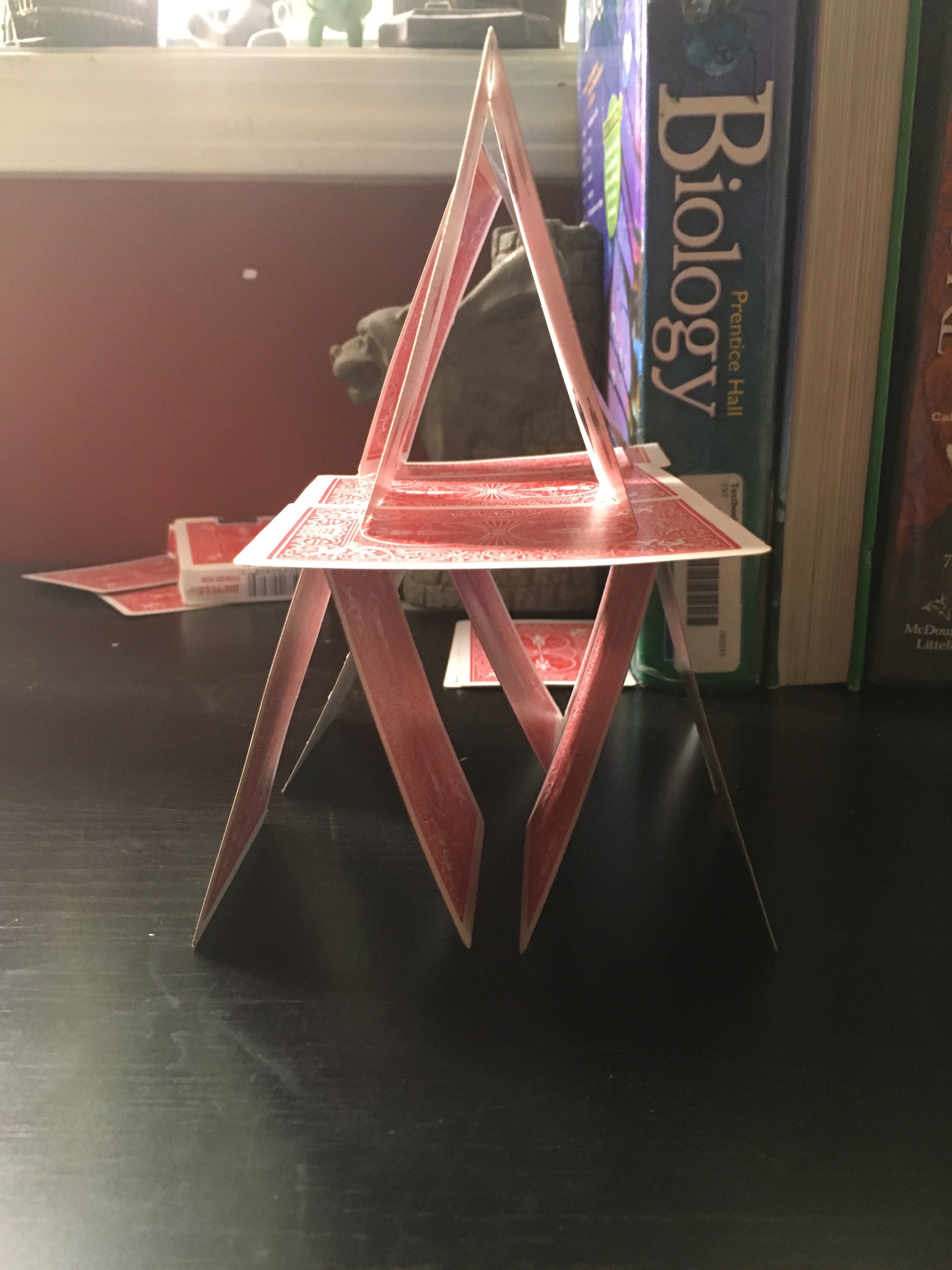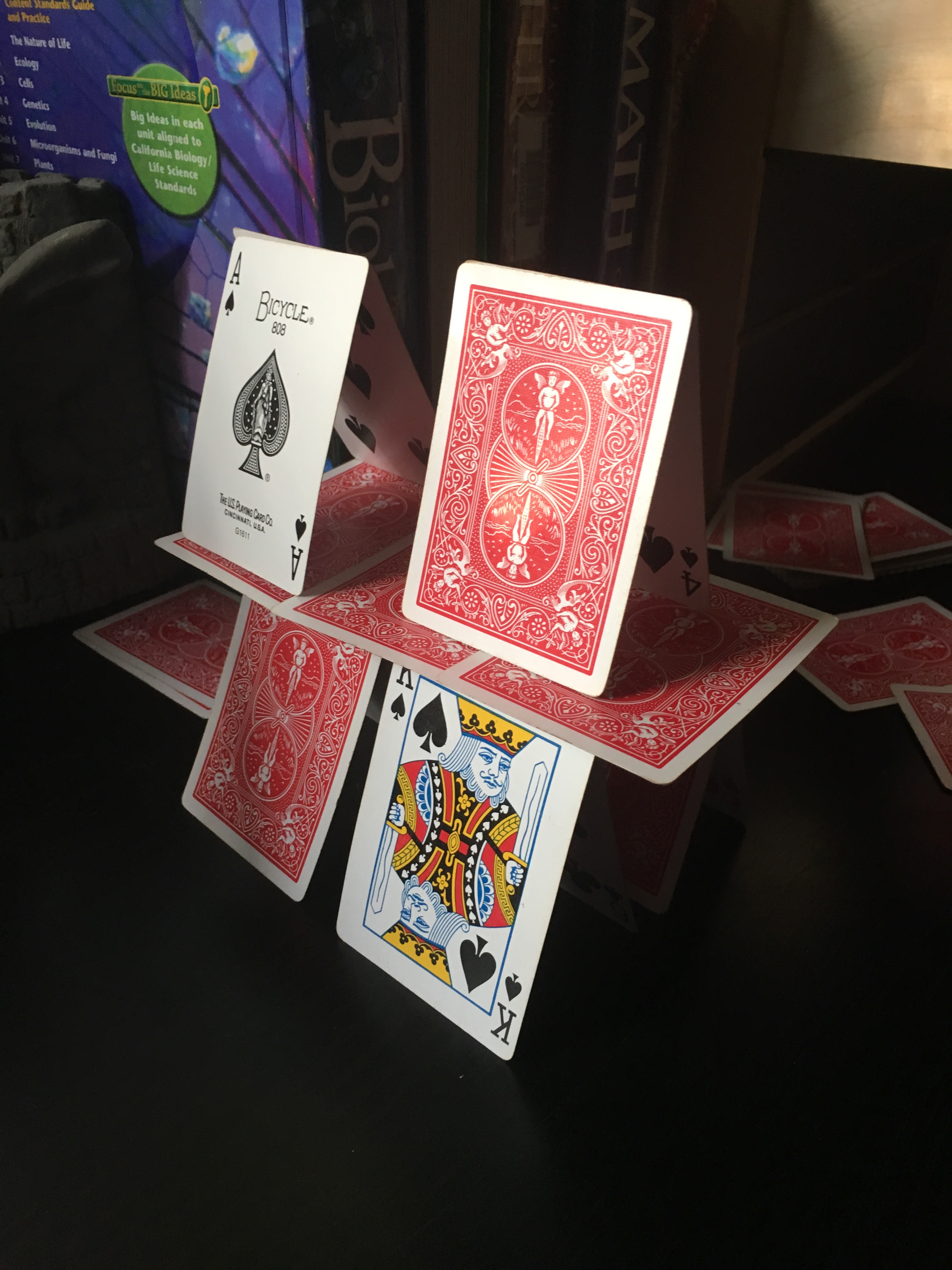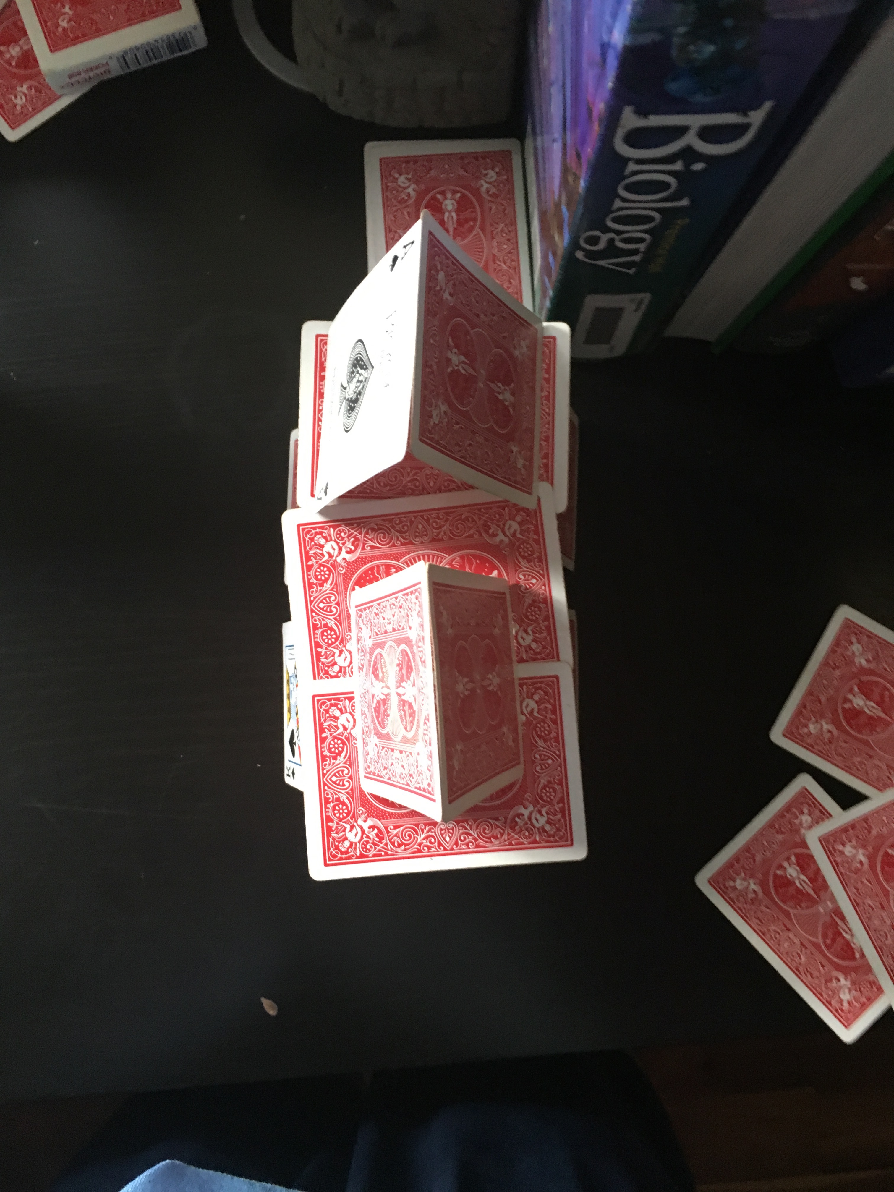 On Wednesday we did a Wednesday Challenge. The Challenge was to build a card house, with no adhesives of course. Our tallest structure turned out to be 7 inches high. There are